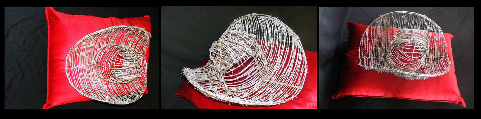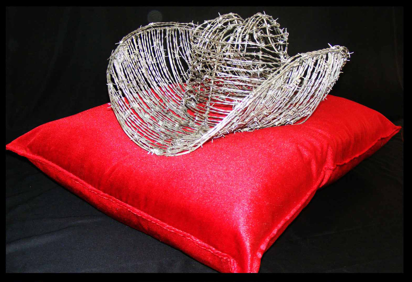 La obra "Corona de Espinas" es una escultura que surge como una reflexión profunda sobre la cultura del narco y su estereotipo, estableciendo una analogía con la violencia arraigada en la religión cristiana. La pieza, realizada con alambre de púas formando una texana, colocada sobre un cojín de terciopelo rojo, pretende explorar la complejidad de la justificación de la violencia en ambas esferas culturales.
