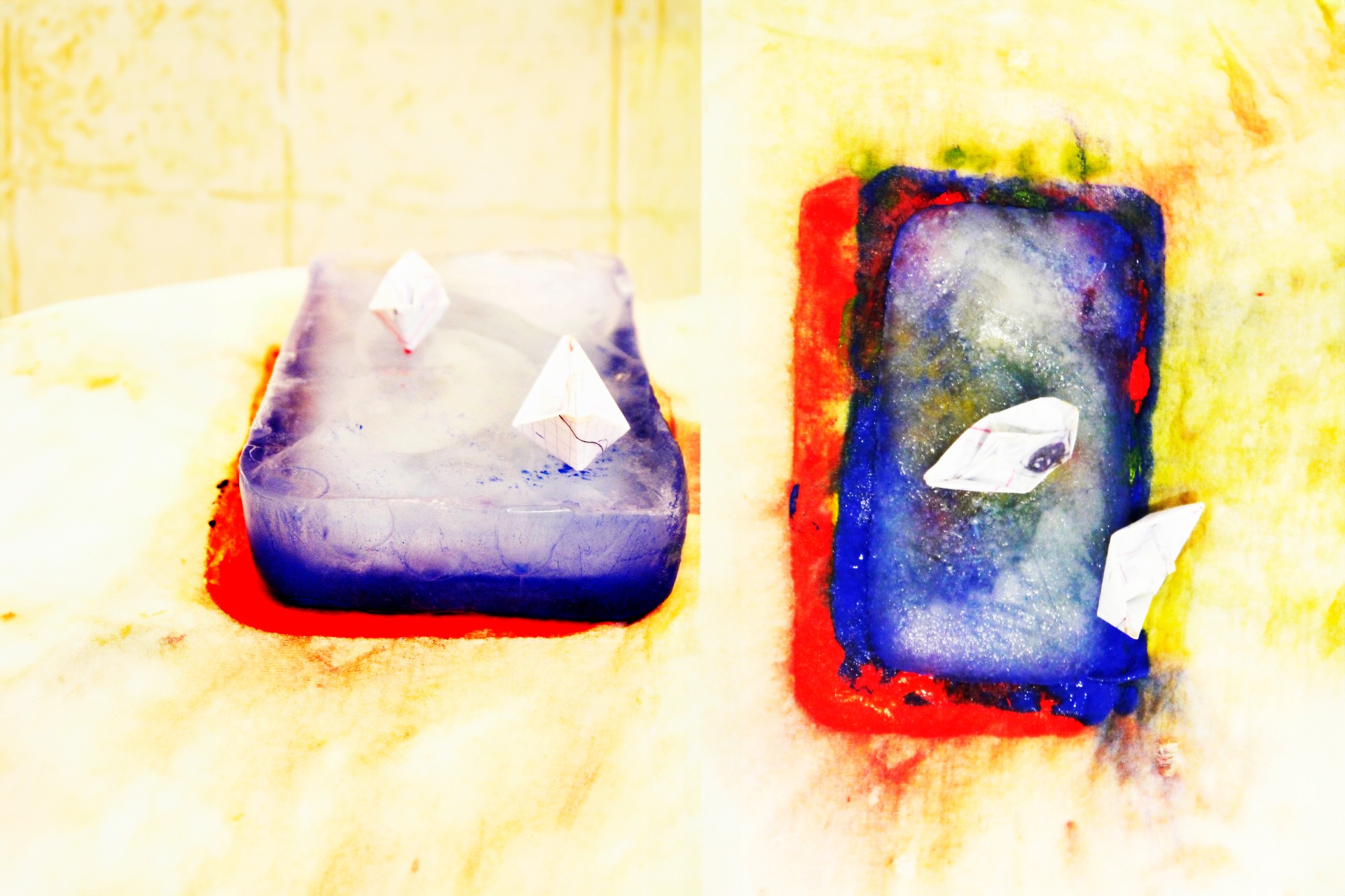 La instalación propone una metáfora visualmente impactante, utilizando tres bloques de hielo, cada uno impregnado con uno de los colores primarios de la luz. Estos bloques representan la pantalla, un espacio donde convergen y se fusionan diversas realidades. La inclusión de Barquitos de papel sobre los bloques de hielo simboliza la marca que dejamos en el mundo real, análoga a la huella que dejamos al interactuar con las pantallas.