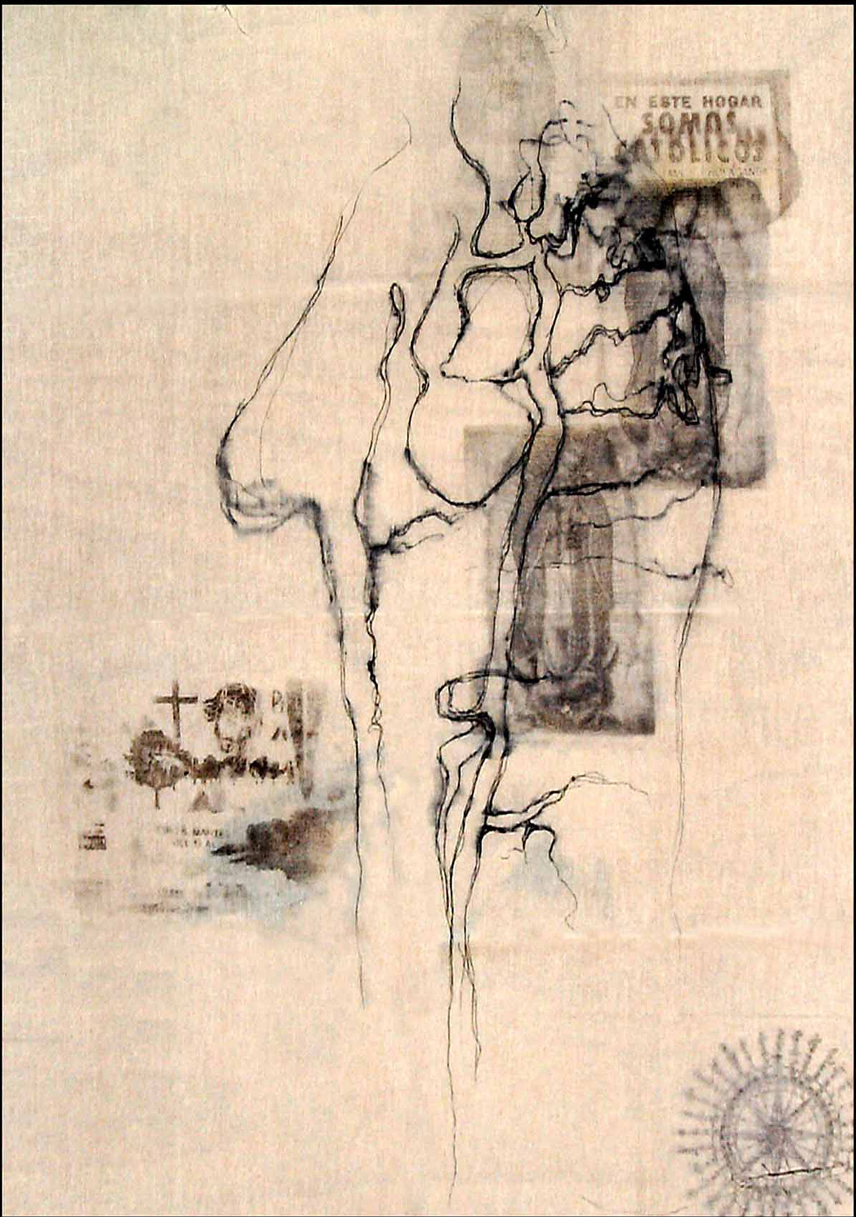 La obra busca explorar la influencia poderosa de las imágenes en la psique humana, desentrañando la intersección entre el poder visual y la condición humana. A través de la técnica de serigrafía y transfer sobre tela, se fusionan elementos visuales cotidianos: señales viales, empaques y simbología religiosa.